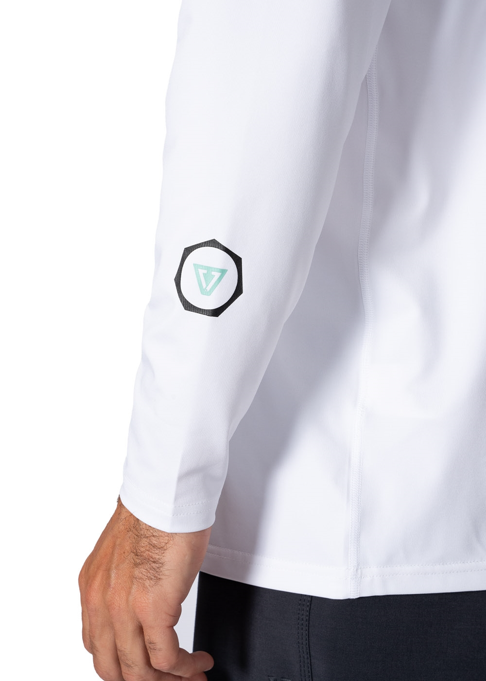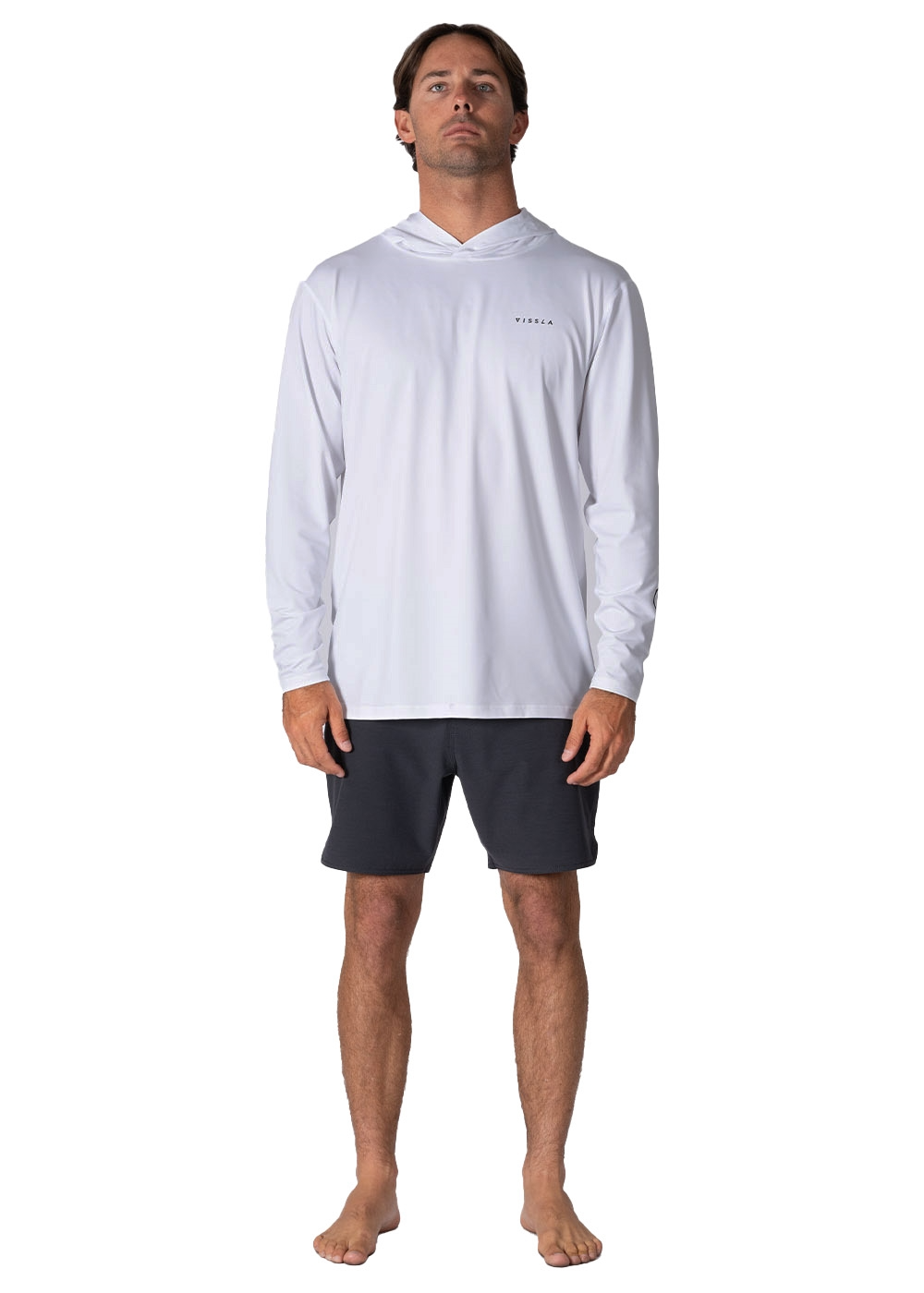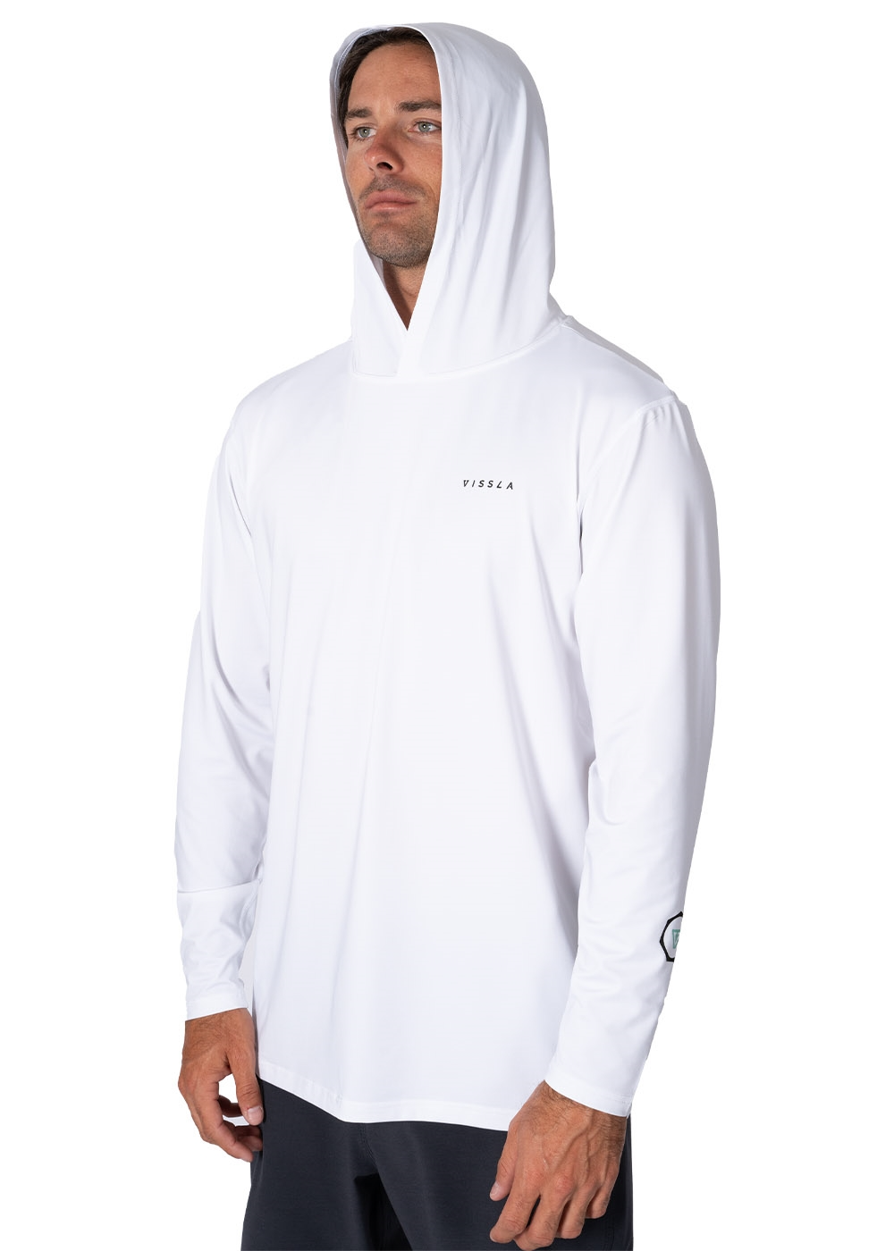 UPF 50+ フード付きロングスリーブ。ソフトで涼しい着心地と持続可能な素材。  フロント胸にスクリーンプリントのロゴをあしらった、理想的な5オンス・ヘザー・サーフTシャツ。フロントの裾に伸縮性のあるループ付き。速乾・ 抗菌・ 吸湿発散性「 UVA/UVBプロテクション50+」
